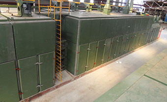 本機型采用大流量橫向循環離心式熱風機。其熱循環方式設計借鑒德國先進干燥機技術優點,新型鋼鋁復合翼片散熱器配專用矩形可變截面噴箱噴孔,使吹向左右單板表面的風速相同。石墨